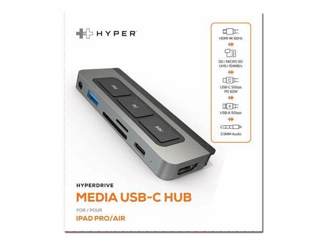 The 6-in-1 USB-C Media Hub for iPad is the World's First form-fitting hub with 6 essential ports and media shortcut keys, allowing you to connect to more devices and seamlessly play, pause, fast-forward or rewind movies, songs, or podcasts, all without interrupting your workflow. Compatible with USB-C iPad Pro, Air or mini.